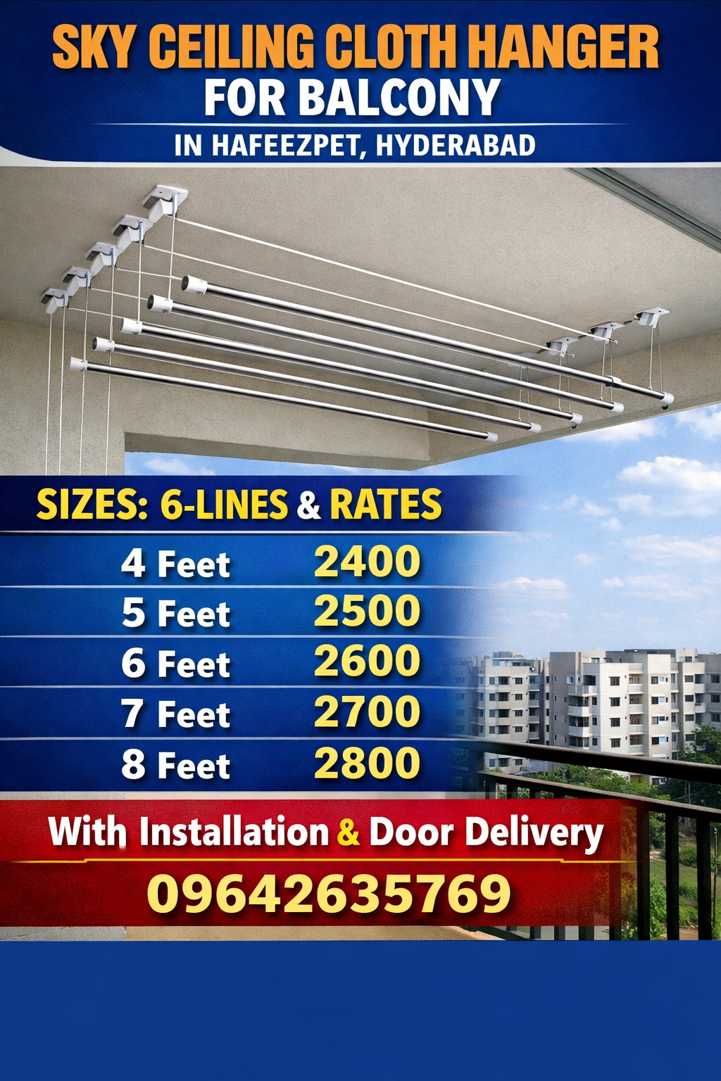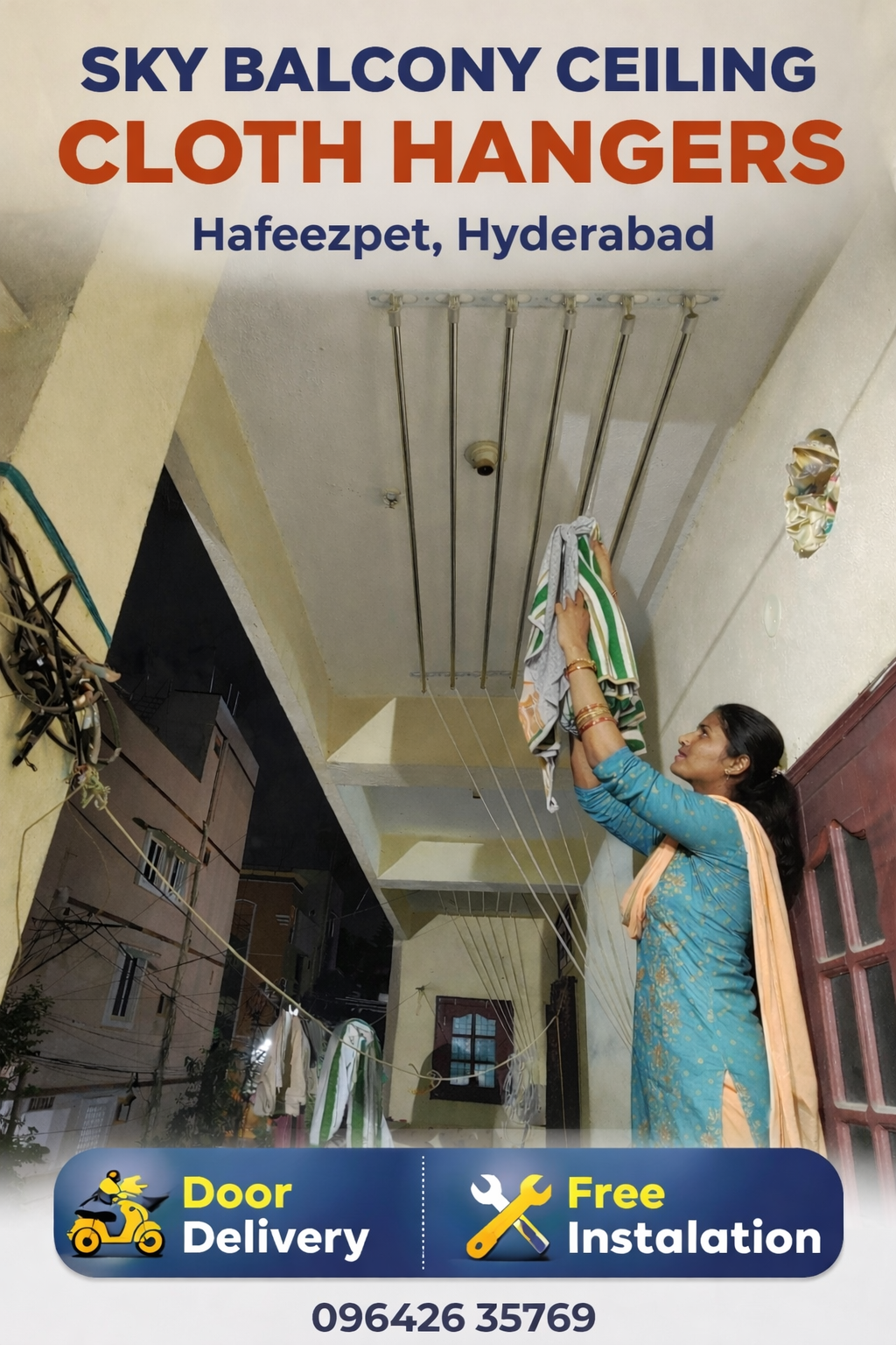 Sky Balcony Cloth Ceiling Hangers are a space-saving solution for drying clothes in small to medium-sized homes. Made from pure stainless steel, they are rust-free and durable, with a one-year warranty. Installation is free and easy, Balcony Cloth Drying Hanger Hyderabad Ceiling Cloth Hanger for Balcony in Hyderabad Ceiling Cloth Dryer in Hyderabad Ceiling Mounted Cloth Hanger Hyderabad Automatic Ceiling Cloth Hanger in Madhapur Hyderabad Stainless Steel Ceiling Cloth Hanger in Gachibowli Nylon Rope Ceiling Cloth Hanger in Hitech City Wall Mounted Ceiling Cloth Hanger in Hafeezpet Ceiling Cloth Hanger Dealers in Kondapur Ceiling Cloth Hanger Balcony in BHEL Hyderabad Ceiling Cloth Hanger in Installation Chanda Nagar